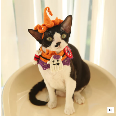 Ropa para mascotas de Halloween con collares de calabaza tejidos a mano y sombreros de bruja
